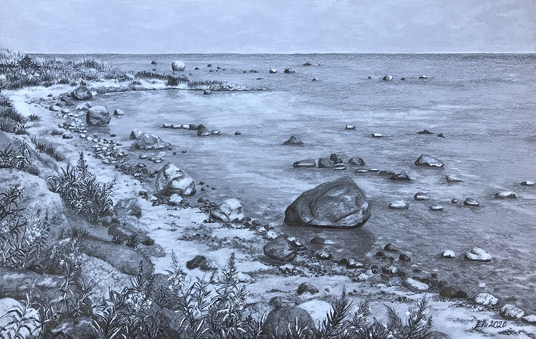 “Rannik” (29,5×19; tušš ja grafiit paberil; 2020)