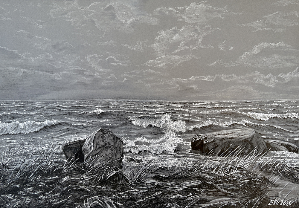“Torm” (40×27,5; tušš ja värvipliiatsid paberil; 2026)